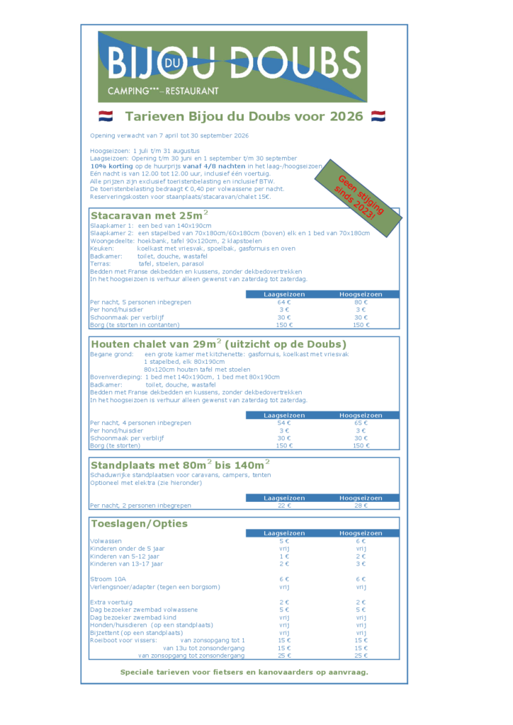 Hieronder vindt u onze prijzen voor het huidige seizoen. Nadat we onze prijzen in 2023 moesten aanpassen vanwege de algemene inflatie, hebben we deze ook in 2026 stabiel gehouden.